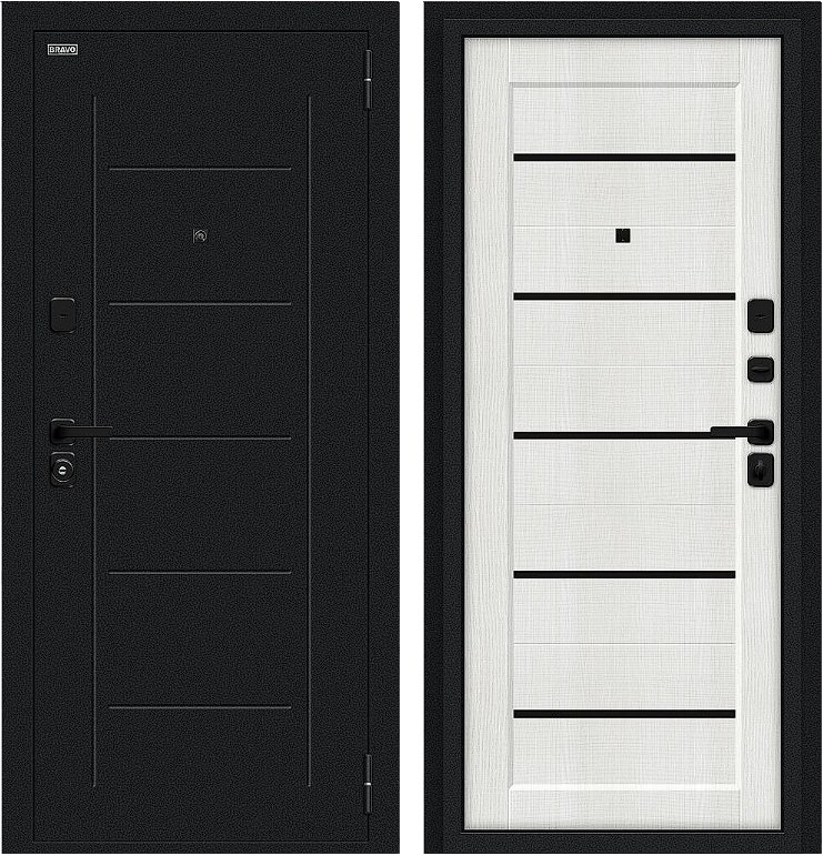 Надежная входная Дверь Браво Борн/SBlack Букле черное/Bianco Melinga премиум класса по цене 31 760 руб. Большая толщина стали защитит от проникновения в ваш дом, квартиру или коттедж. Используется очень качественная фурнитура: замки, цилиндры, ручки, защелки. Покрытие и отделка двери изготовлено под внимательным контролем производителя. Дверь имеет долгий срок службы и гарантию.