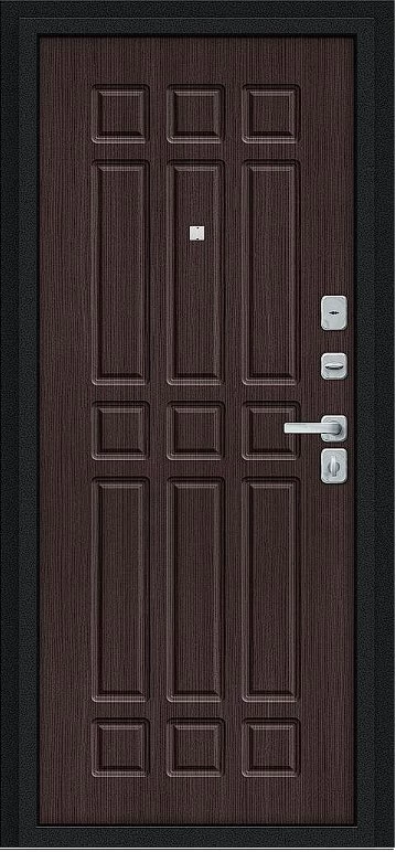 Надежная входная Дверь Браво Мило МФ/BChrome Букле черное/Букле черное/Wenge Melinga премиум класса по цене 33 210 руб. Большая толщина стали защитит от проникновения в ваш дом, квартиру или коттедж. Используется очень качественная фурнитура: замки, цилиндры, ручки, защелки. Покрытие и отделка двери изготовлено под внимательным контролем производителя. Дверь имеет долгий срок службы и гарантию.