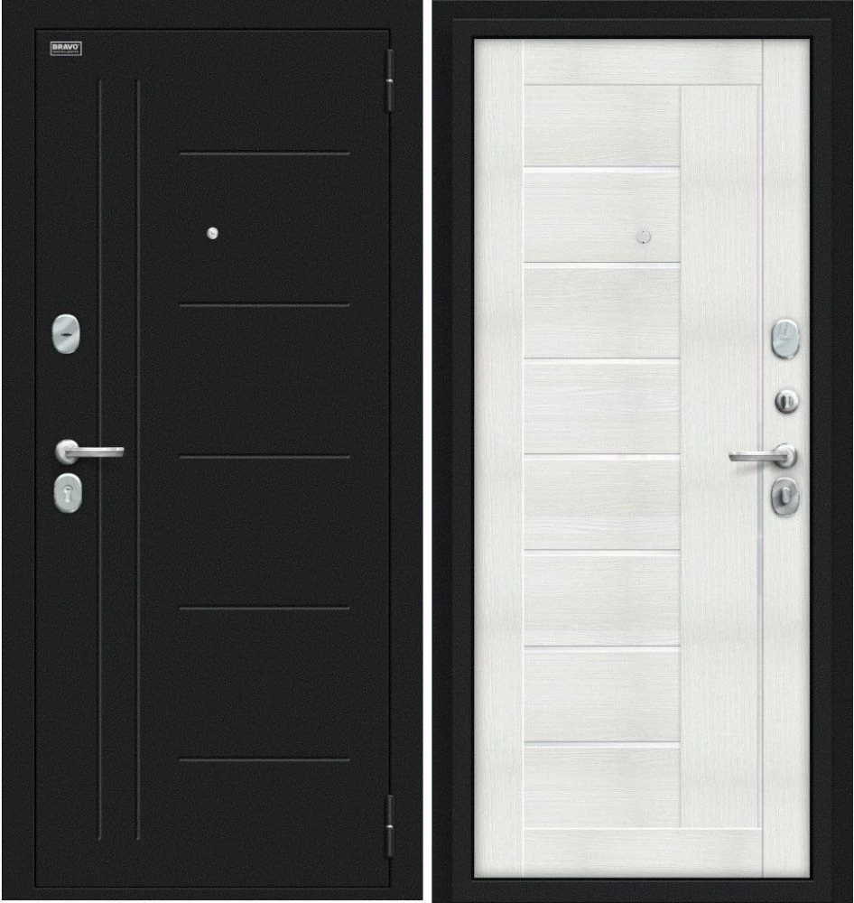 Надежная входная Дверь Браво Проф Букле черное/Bianco Veralinga премиум класса по цене 33 210 руб. Большая толщина стали защитит от проникновения в ваш дом, квартиру или коттедж. Используется очень качественная фурнитура: замки, цилиндры, ручки, защелки. Покрытие и отделка двери изготовлено под внимательным контролем производителя. Дверь имеет долгий срок службы и гарантию.