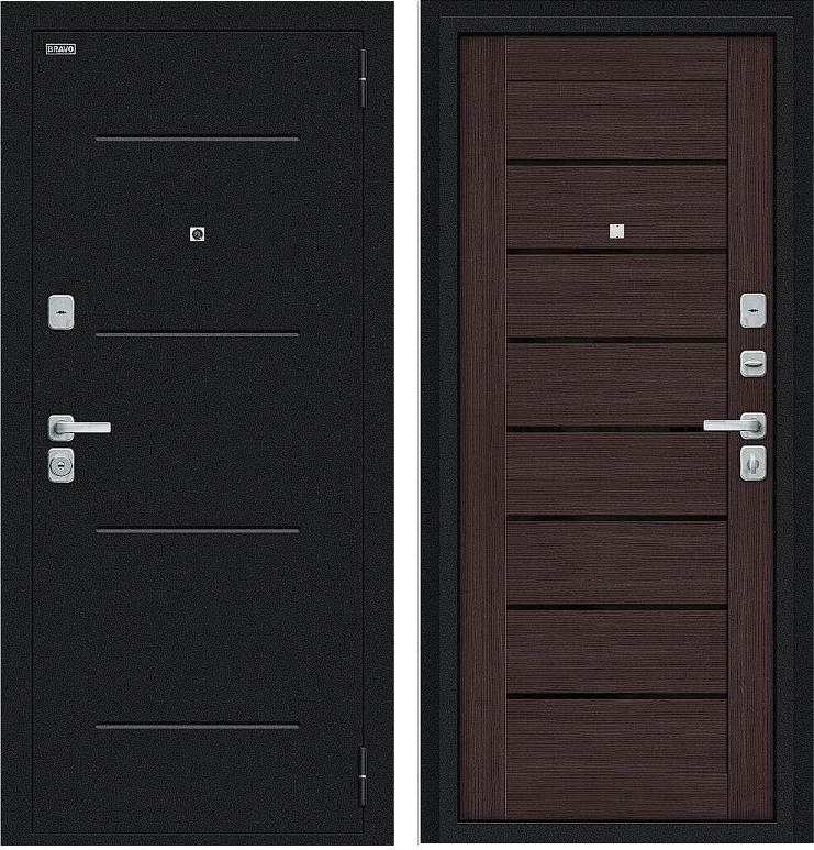 Надежная входная Дверь Браво Техно/BChrome Букле черное/Wenge Melinga премиум класса по цене 33 360 руб. Большая толщина стали защитит от проникновения в ваш дом, квартиру или коттедж. Используется очень качественная фурнитура: замки, цилиндры, ручки, защелки. Покрытие и отделка двери изготовлено под внимательным контролем производителя. Дверь имеет долгий срок службы и гарантию.