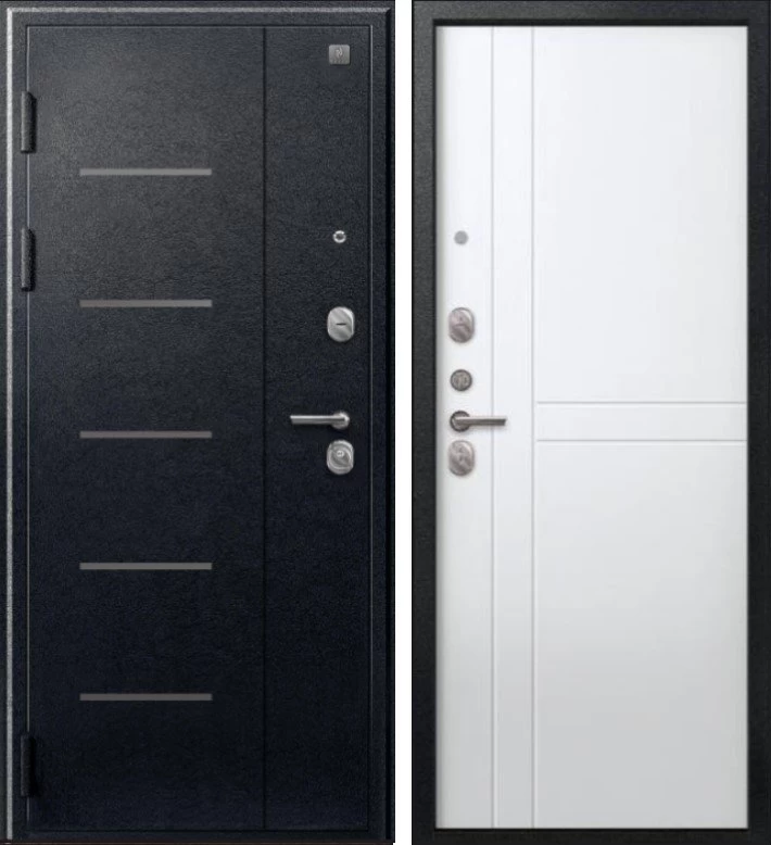 Надежная входная Дверь V-06 Черный муар - Белый премиум класса по цене 39 110 руб. Большая толщина стали защитит от проникновения в ваш дом, квартиру или коттедж. Используется очень качественная фурнитура: замки, цилиндры, ручки, защелки. Покрытие и отделка двери изготовлено под внимательным контролем производителя. Дверь имеет долгий срок службы и гарантию.